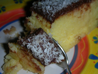 Comuqnue, dove dicono che "l'impasto si divide", a mio parere non è che si divida l'impasto, ma la diversa consistenza è data dal livello dell'acqua: la parte sotto del dolce, quello circondato dall'acqua, resta più morbido... Una via di mezzo tra una panna cotta e un cheesecake. La parte superiore invece, che è oltre il livello dell'acqua, diventa più compatta, e friabile per via della farina di cocco. Si vede abbastanza in questa foto, anche se il giorno dopo si vede di più la divisione tra le due.